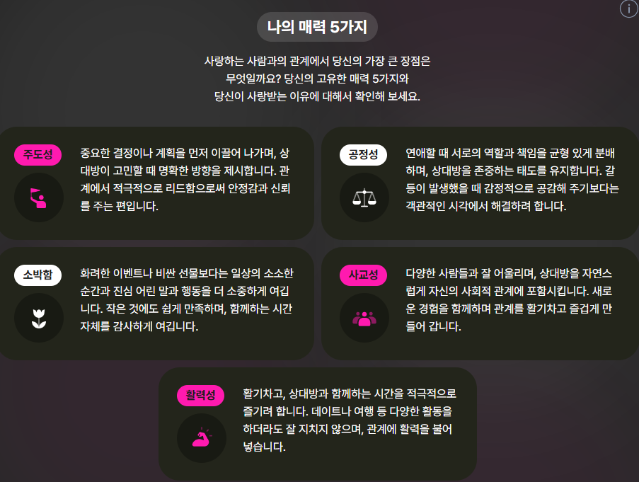 - 결과를 바탕으로 “내가 진짜 원하는 연애 스타일은 무엇인지”, “어떤 유형과 케미가 좋은지”를 명확하게 알게 되어, 앞으로 데이트 방향성을 설정하는 데 큰 도움이 될 것 같습니다.