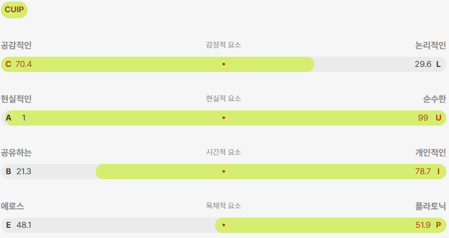 아래는 제가 직접 검사해보고 얻은 결과입니다. “사슴(CUIP)” 유형으로 분류되었고, 네 가지 심리 요소별 점수와 세부 프로필은 다음과 같습니다.