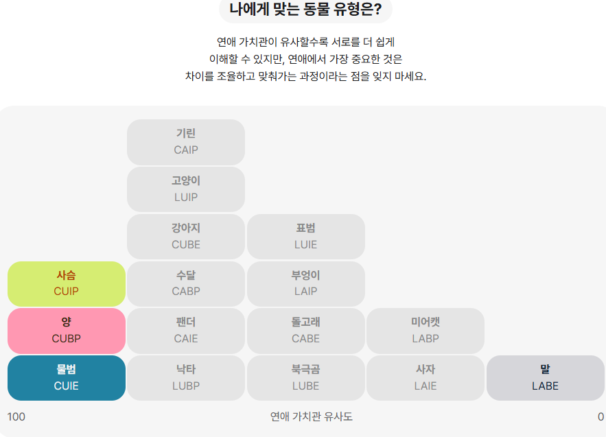 - 목적: 연애 상황에서 느끼는 나의 감정, 태도, 가치관, 행동 패턴을 분석하여 16가지 동물 유형으로 분류