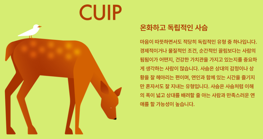 - **“사슴형(CUIP)”**으로 분류된 저는 감정적이면서도 순수하고, 개인적인 시간을 중시하는 플라토닉 성향을 갖고 있다는 것을 깨달았습니다.